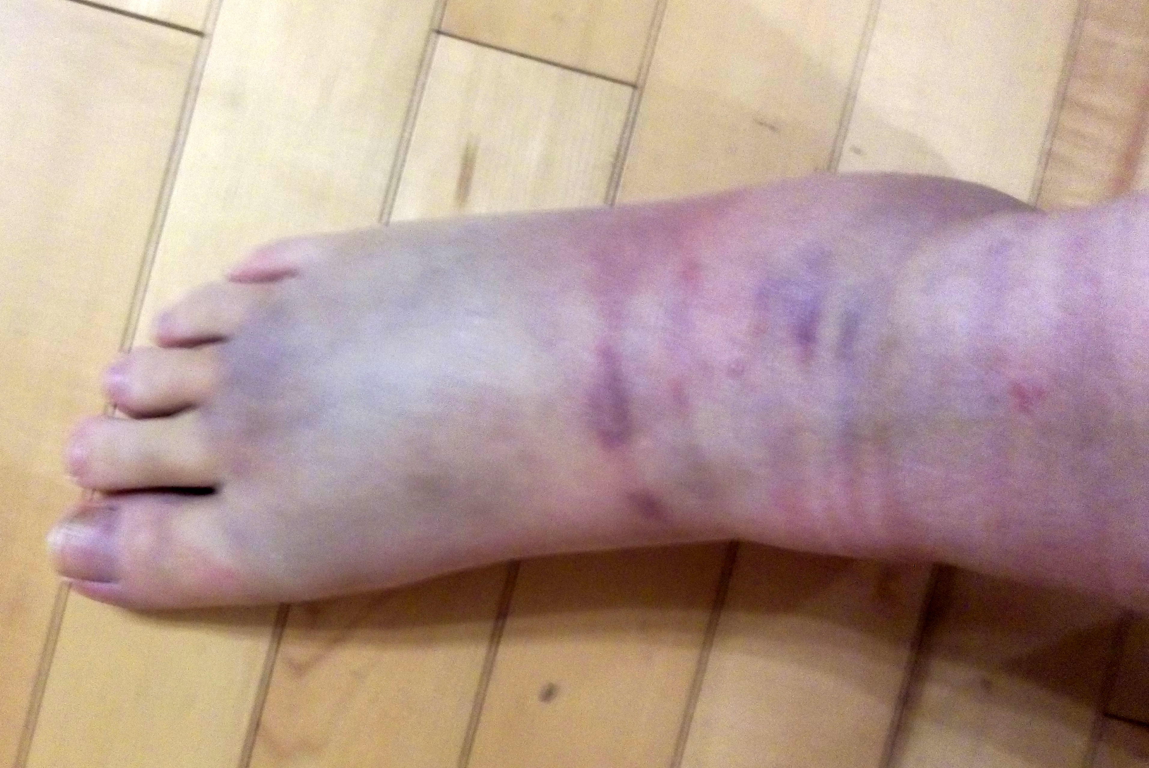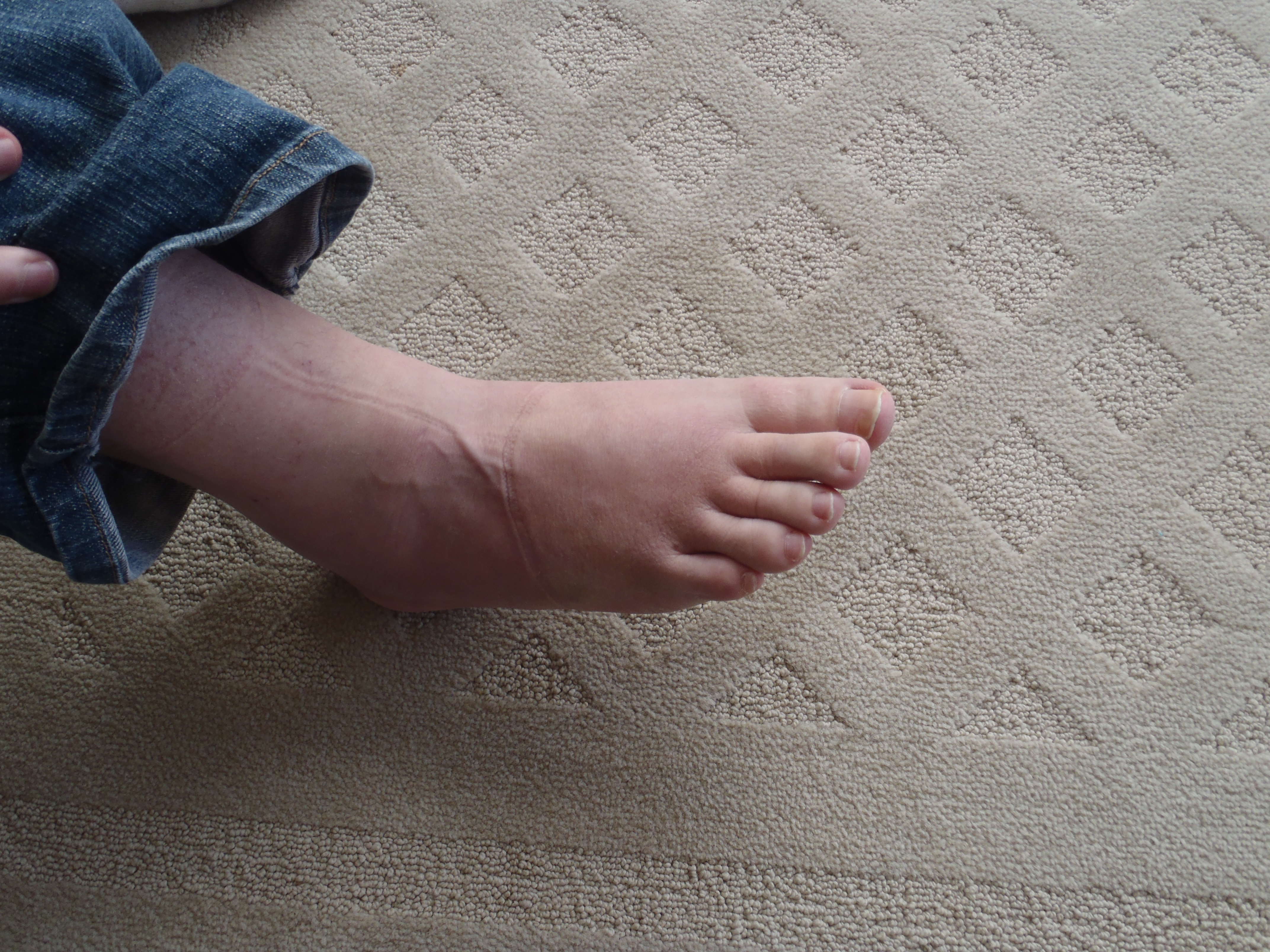 Side view of twisted ankle on April 9th. Bruising is still visible along bottom edge of foot and there is still some swelling.