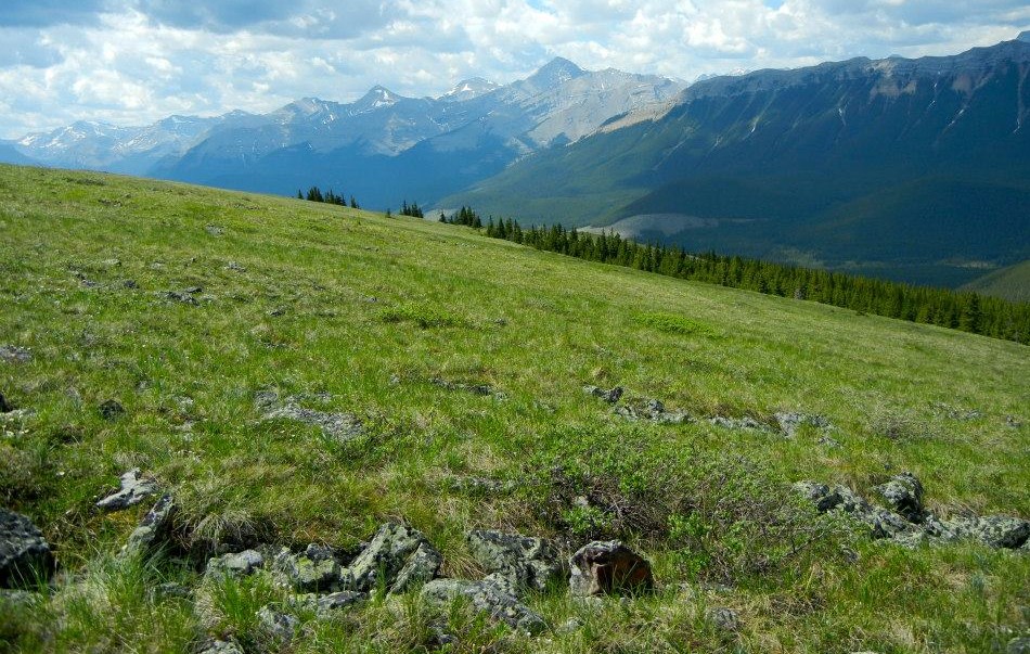 Continue hiking up through the meadows, staying on the trail, until you come to the pass. You will know you are at the pass, because there is a small pile of stones. If you were to continue on the trail, it starts to descend.