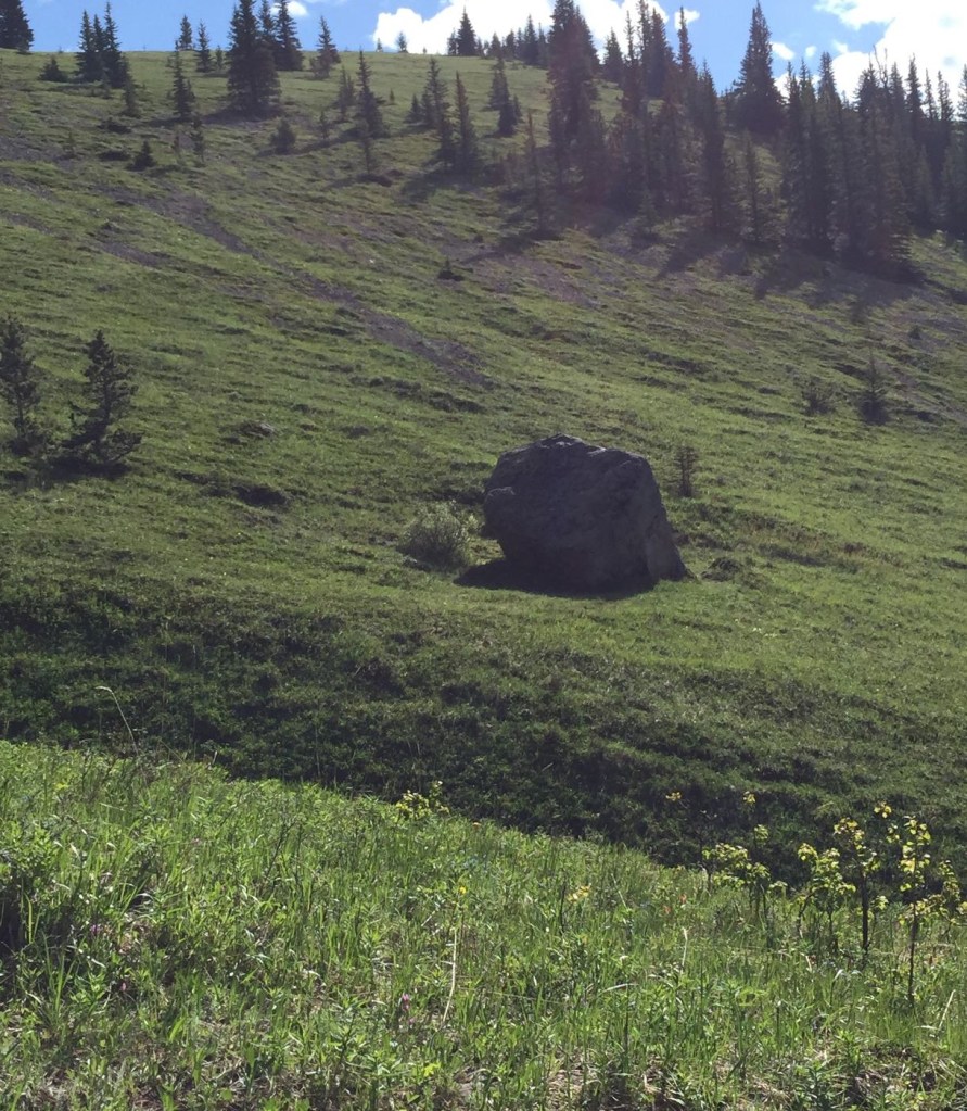 The erratic is not on the trail. It is in the middle of the first, or lower meadow. We know it’s an erratic because there is no other rock avalanche debris around it, and because there is nothing high enough for it to have tumbled off of.Annette got up close and personal with the erratic. The rock is well covered in lichen, which shows it’s age. It is also not crushed to bits from the glacier, like the limestone chips that it sits upon.