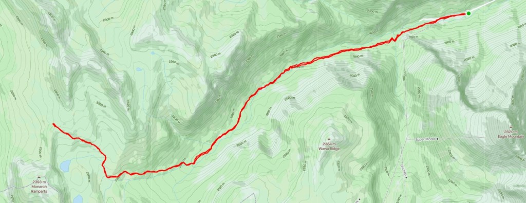 The distance to Healy Pass is 9.4 KM. The elevation at the pass is 2,508 m. According to Gaia, the elevation gain was 760 m. It took us 2 hrs 24 min.