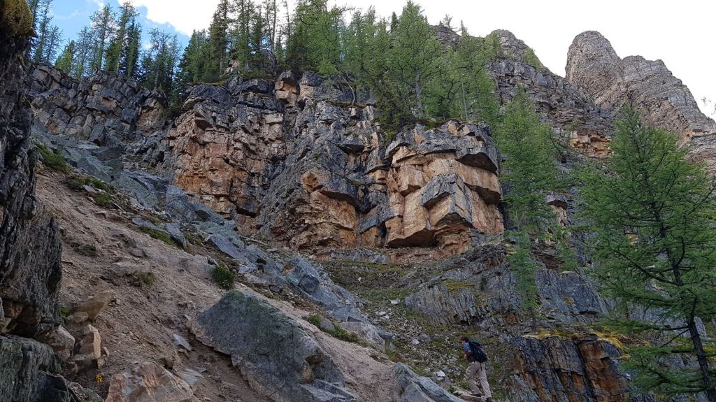 Keep an eye out for the gorgeous rock formations along this section. Lake Louise is home to quartzite, which is a hard metamorphic rock. It is way harder than limestone, which is why this steep slope is a consolidated trail and not a messy scree slope. Enjoy!!!