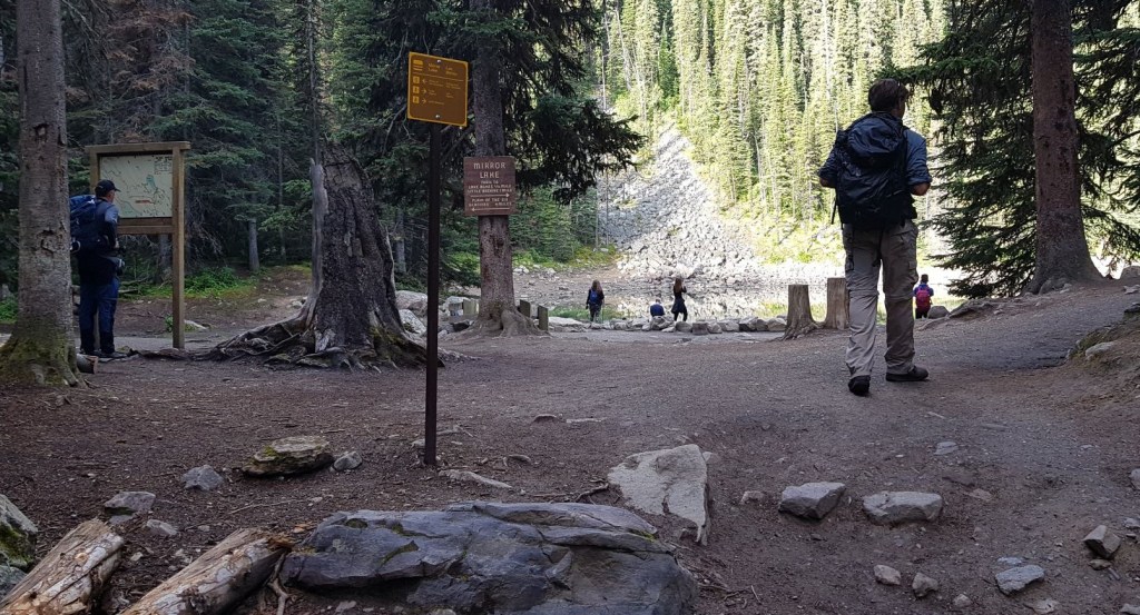 Mirror Lake is at 2.6 km from the trail head (3.1 from parking lot). If you take the alternate return route from Lake Agnes, you pop out on the south side of Mirror Lake.