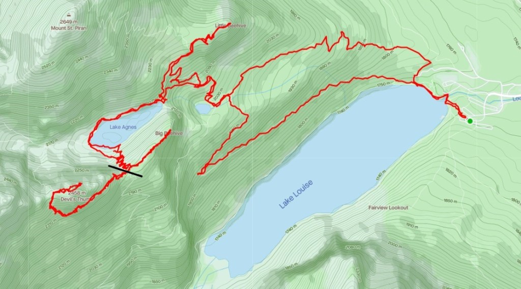 The distance from Lake Agnes to the Little Beehive is about 1 km, with about 80 m (265′) of elevation gain.