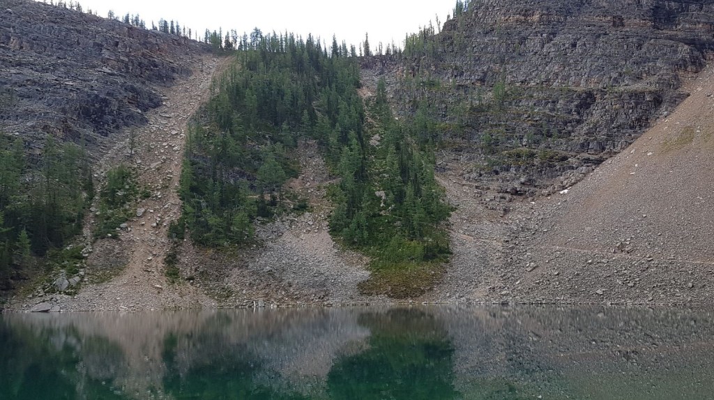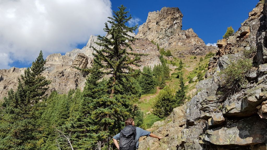 At the end of the trail, we turned the corner to start looking straight up the mountain. This was our first view of the Whyte/Devil’s Thumb col.