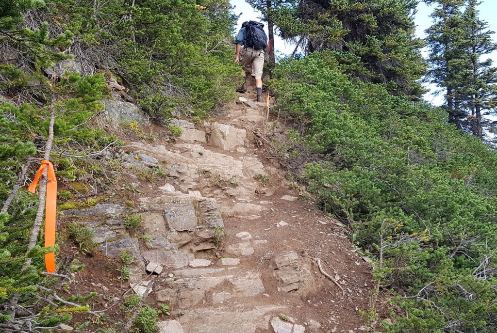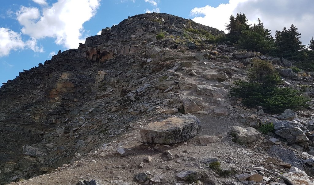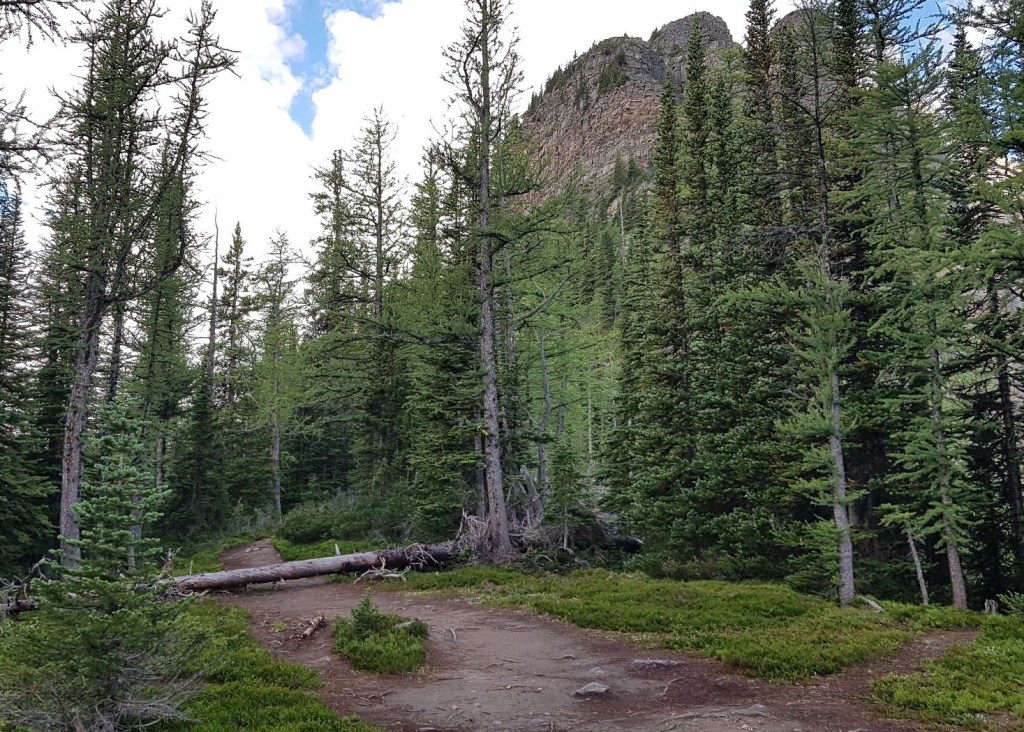 Once at the Big Beehive pass, turn right (roughly south west), and head into the forest. There is no signage, and you will see several large logs placed over this very obvious trail. This is to keep the causal tourist from continuing up. I do not ever want to discourage anyone from hiking in the mountains, however I did see a few people who were ill equipped mentally and physically to head up to this summit. The Parks Search and Rescue must have had one too many rescues.