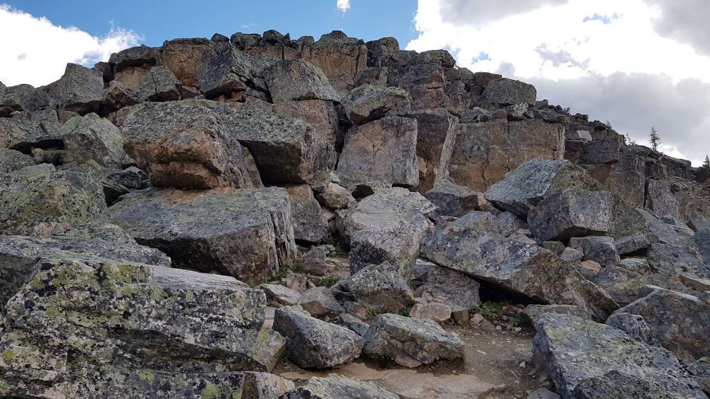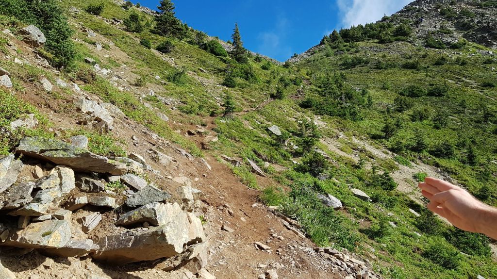 Above this section, the trail angles off to the right to the top of the col, which is the base of the Devil’s Thumb final ascent.