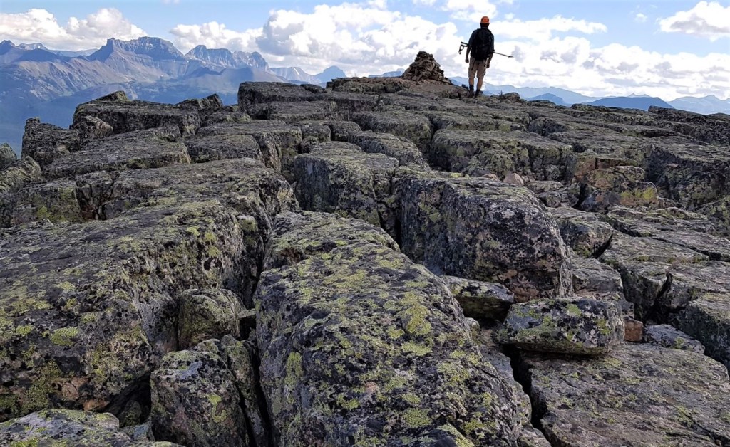 The summit of Devil’s Thumb is a flat expanse of cracked quartzite rock. This is very similar to the summit of The Tower of Babel, located above Moraine Lake.