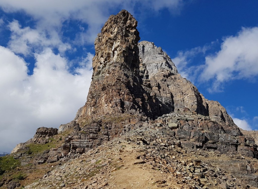 From Lake Louise, hike up to Lake Agnes. Hike to the back of the lake to the Big Beehive pass. At the pass, turn right and head uphill. Follow the trail around to the left (south) side of the mountain. At the base of the col, head straight up until you reach the Whyte/Devi’s Thumb Col. Turn right and continue to the summit.