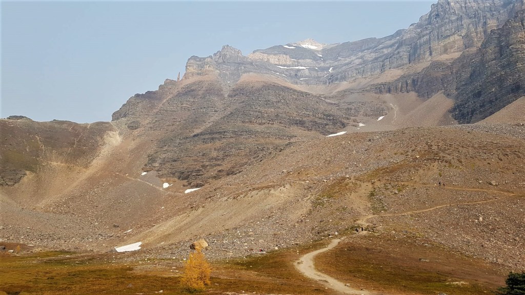 The ascent to Sentinel Pass looks daunting. It is a near vertical wall that gets steeper as you ascend. I can see why it intimidates the casual hiker. It is 220 m (720′) of elevation gain over a very short distance. Fortunately, the trail was made by the same pipe smoking guide. The ascent first curves around the base of Mount Temple, and then starts a series of long, sweeping switchbacks that gently guides you to the top of Sentinel Pass.