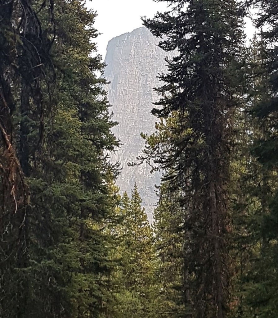 This is where the payoff begins. First off, the elevation backs way off as you are now in Larch Valley between Eiffel Peak (left) and Mount Temple (right). It is a gorgeous walk through the trees, with glimpses of the mountains above.