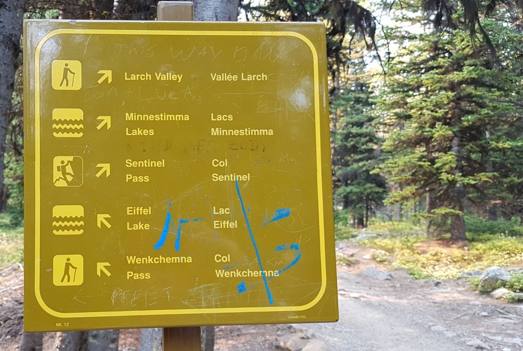 From the Moraine Lake parking lot (where the shuttle dropped you off :-), head right (south west) along the shore, past Moraine Lake Lodge and the little cabins. After walking for about 200 m, we found the trail sign. Take the Right trail heading uphill to Sentinel Pass.
