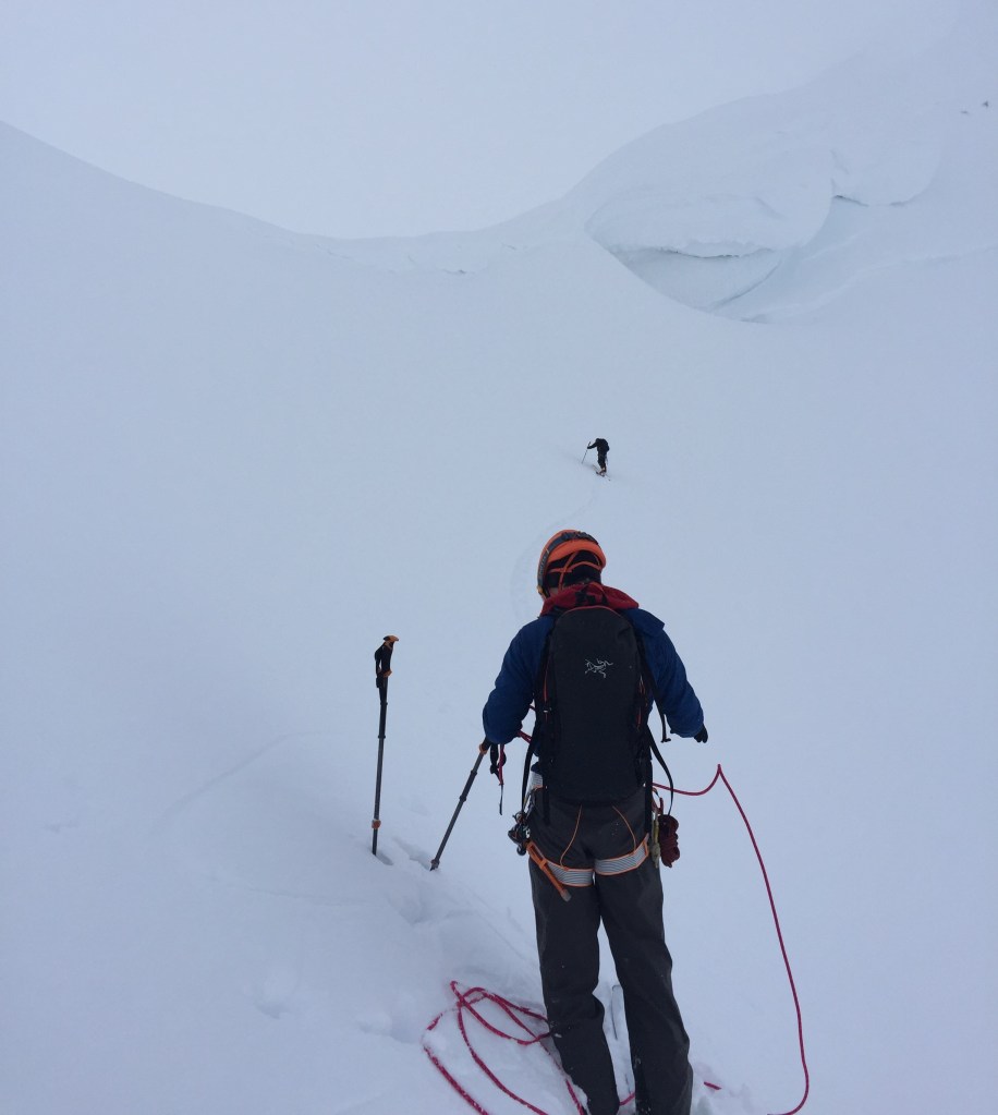 This is an area aptly named Cornice Ridge. From above, these unsupported snow shelves look like solid ground. It is actually very difficult to tell if you are walking on solid ground, or an unsupported shelf.