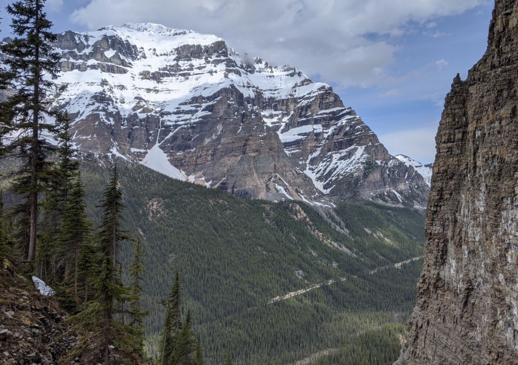This is a view of Moraine Lake Road from The Tower of Babel. The ski track setting ends far to the right. What you cannot see while on the road is the absolutely massive avalanche funnel far above on Mount Temple. We saw dozens (!!!) of avalanches spin down during our trip in June. I’d hate to be under that in the middle of winter.