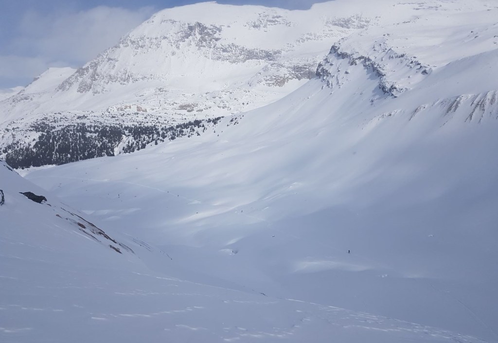 To ski down from the Bow Hut, take the wide middle gully that you avoided on the way up.