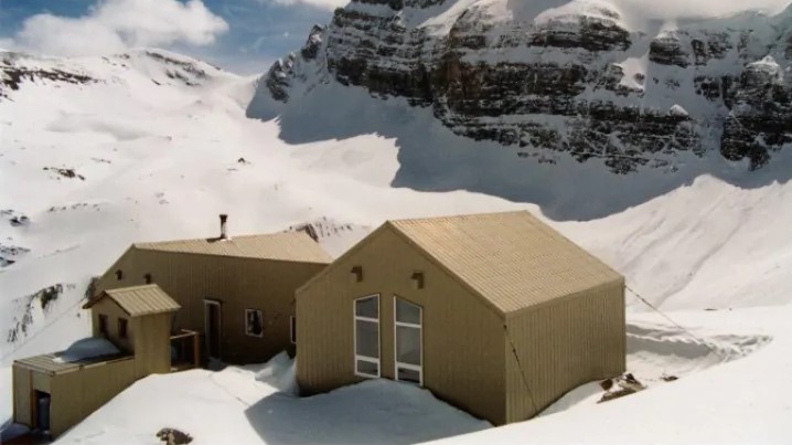 This is the backside of the Bow Hut. The area closest is the sleeping bunks. The extension off the back is the double outhouse (which is now fully enclosed and connected to the rest of the hut). Photo Credit Alpine Club of Canada.
