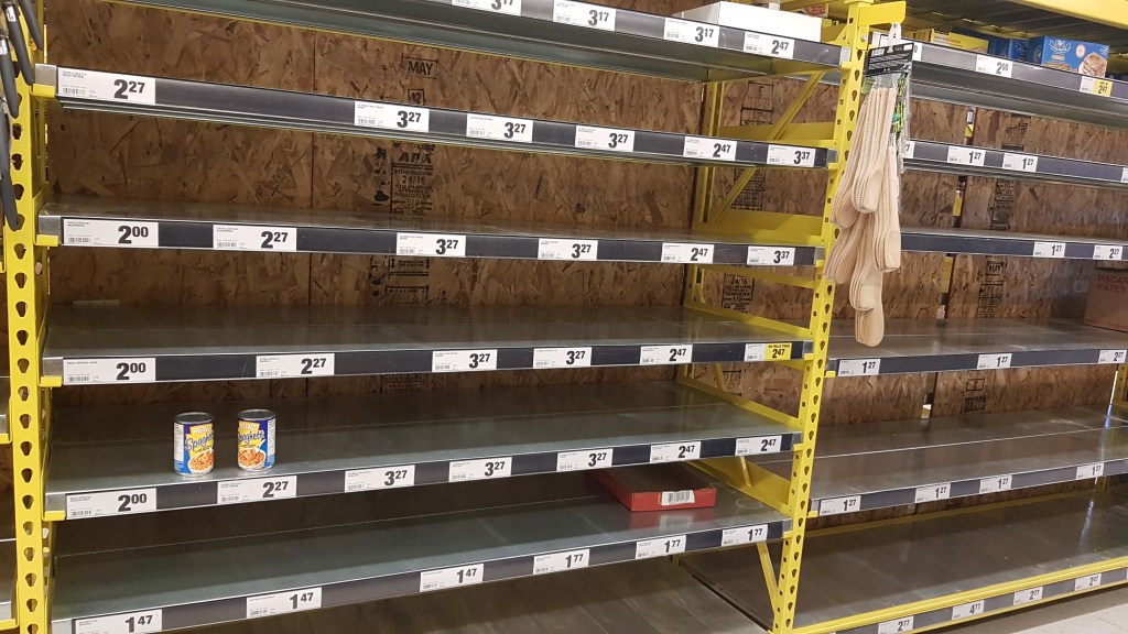 These were the shelves at our local grocery story in small town Okotoks. We were completely caught off guard by the hoarding. It was well underway by the time we got off the Bonnington Traverse. Shocking.