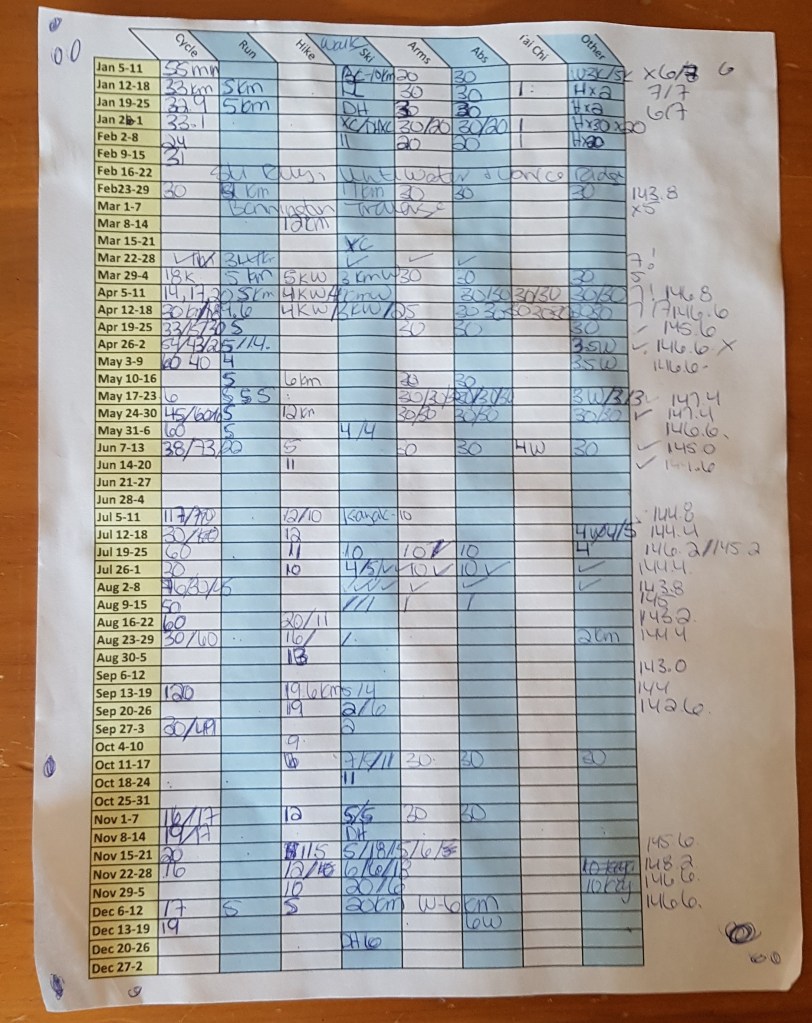 To be successful, I have to track my progress. I created a 52 week sheet, with various activities across the top. Every day I would record distances or number of reps per activity. I quickly realized that some of the exercises I chose were not ideal or sustainable. Next year, I’ll also leave some blank spots – always good to be open to new ideas!