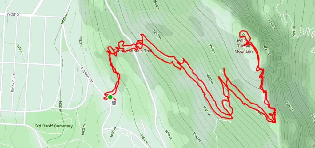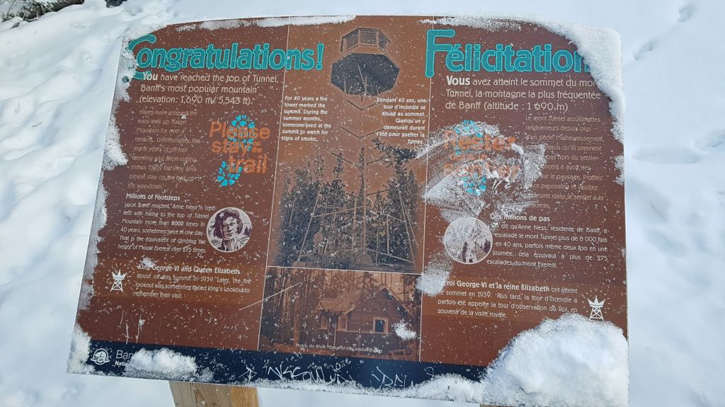 Distance to the top of Tunnel Mountain is about 2.5 km. The elevation gain is 260 m or 858′. Time to summit was about 50 minutes. It’s not a race to the top, so go your own pace and enjoy the trip.
