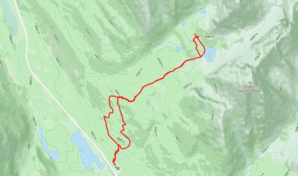 The ski trail curves around the left side of Chester Lake. When you can’t go straight any longer, the lake is on your right. Distance to Chester Lake is 4.5 km. Time to the lake was about 1 hour, 50 minutes.