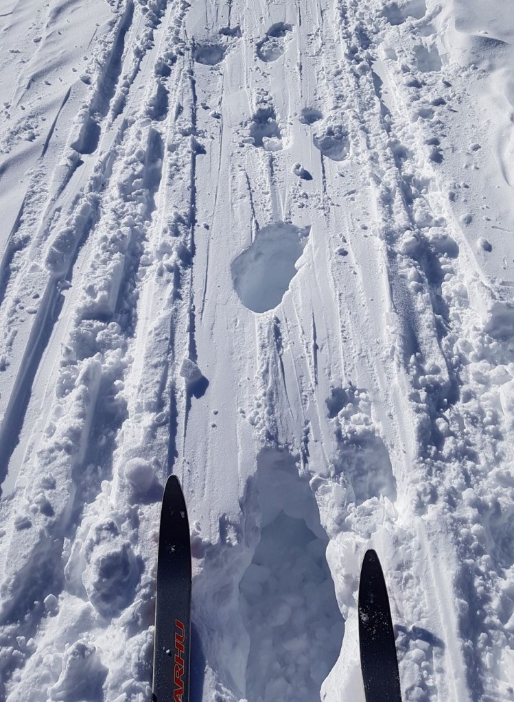 Post-holing is dangerous to skiers because we cannot simply walk around a hole. Skiers have a limited area in which to gain purchase on our skis, especially when going up hill. The bottom of our skis HAVE to make contact with the snow the entire length of our ski. A gaping hole under the ski means the skier can no longer get a grip, and they will fall. Walking on ski trails puts holes in the snow, ruining the trail.