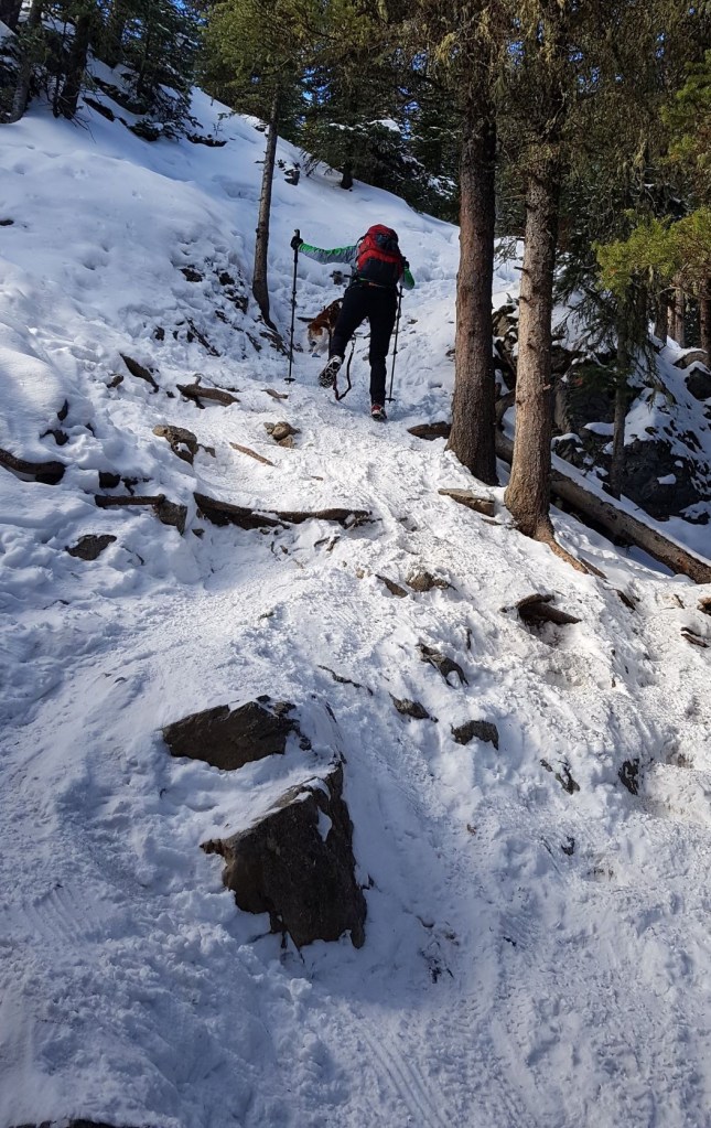 • if the trail is slick or icy, then walk in the deep snow on the edge of the trail. Deep snow slows you down, and reduces the steepness of the angle. Again, dig in with your heels.