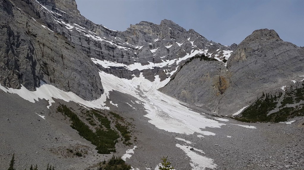 At the 4 km mark, there is a little rise of rocks. This is ideally placed to show off the impressive Cascade Mountain C Level Cirque. Avalanche debris filled the basin, and a small snow and rock avalanche came down just as I was leaving the high point of the trail.