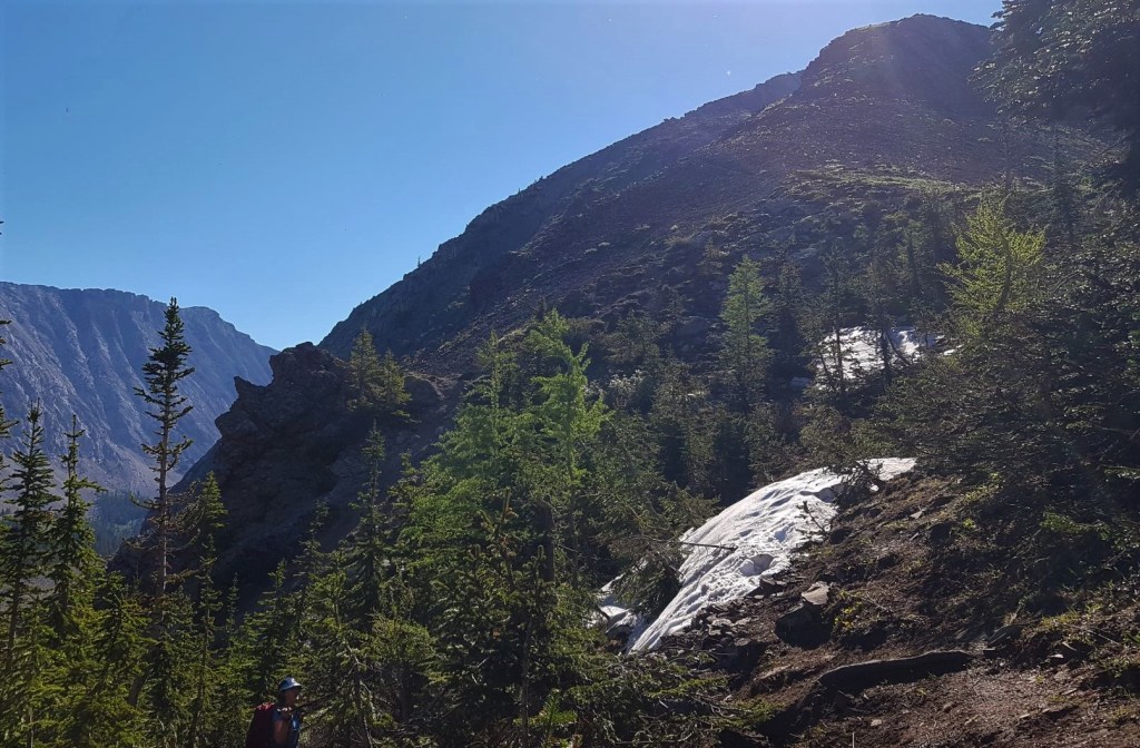 From the high point, it’s a walk down a well trodden scree slope to the first lake. Be aware of the avalanche chutes on the side of Lineham Ridge.