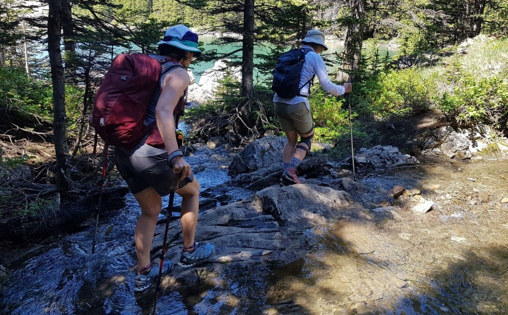 As we were down on the shore, we continued around the other side of the third lake. This required some creek crossings, and a bit of hunting for the right trail. It wasn’t really worth it. If you are just admiring the lake from above, then return along the scree slope to the second lake.