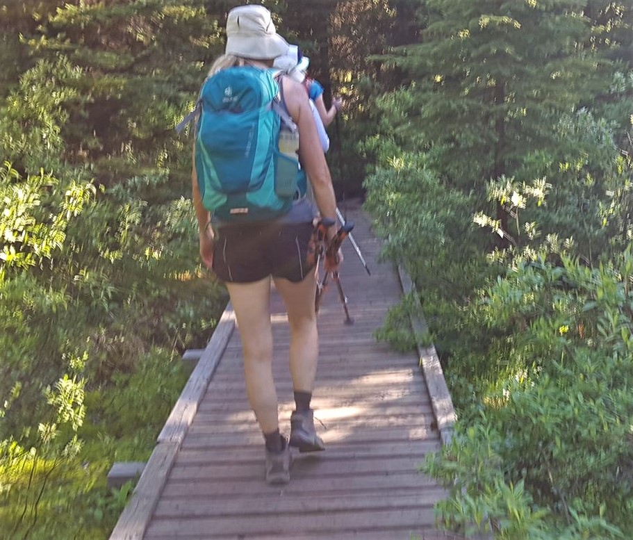 Annette (2015 hike) going over the rock spur. This is the high point of the trail.