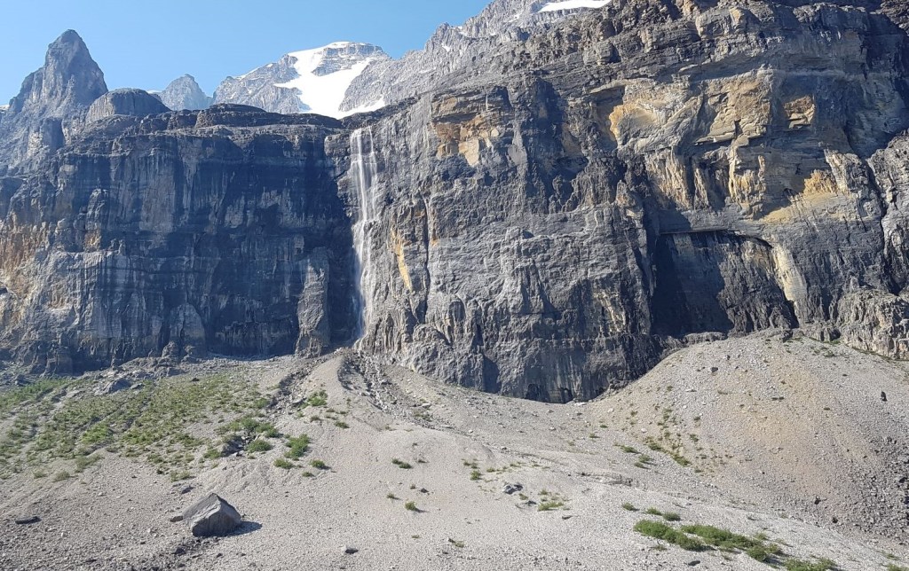 After a delightful spray on a hot day to cool us off, we traversed over to the toe of the Stanley Glacier. After we went back down to the Stanley Creek Lookout, we met a group of 70 somethings. The last time they were up on Stanley, the glacier had a little cave on it (similar to the ice cave above Bow Hut right now). We had to tell them it was gone. Disappointment was felt by us all.