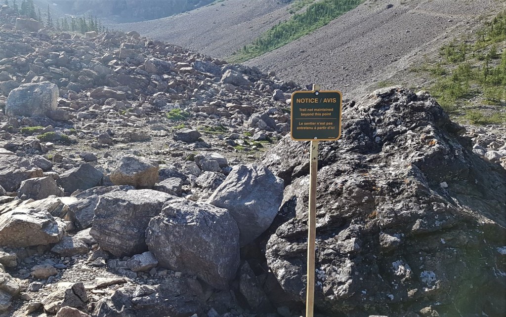 Above this, the trail turns left at the sign. The trail used to go straight here, but I imagine trail slumping or avalanches took it out.