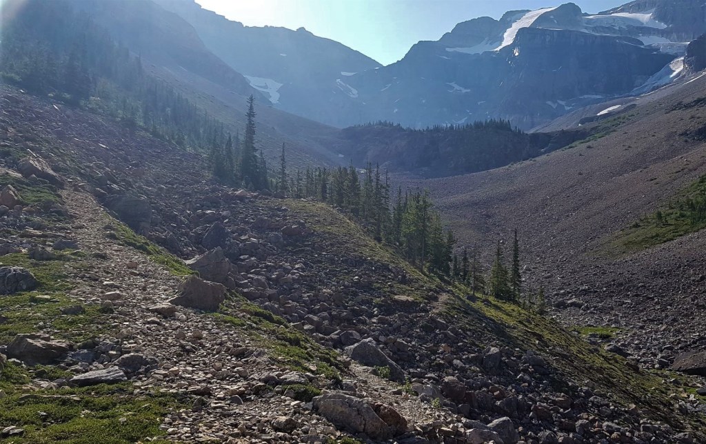 The trail to the headwall is on the left, and curves around to the right, staying as high as possible. There are some fainter trails, but try and stick to the main one.