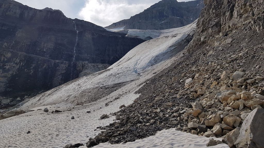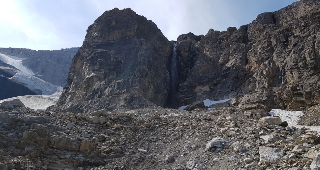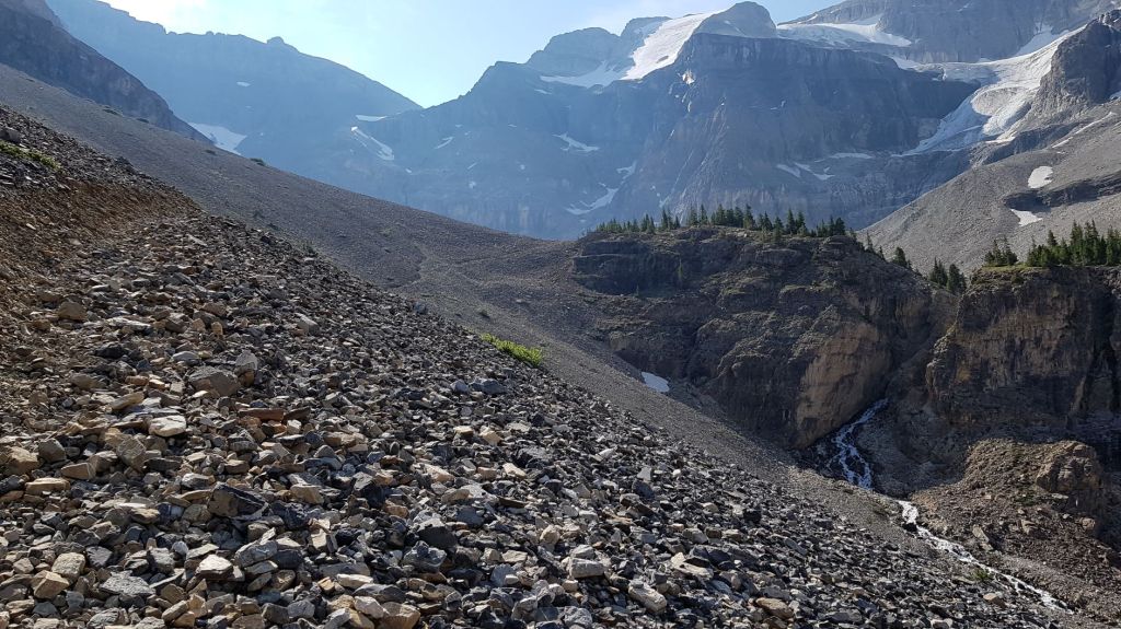 About five years ago, I started looking for snow year round (I know. How very Canadian of me.). This was my #SnowInJuly photo. From here, we walked along the rock pile on the left, and turned right just above the start of the creek. The start of the moraine is on the right.