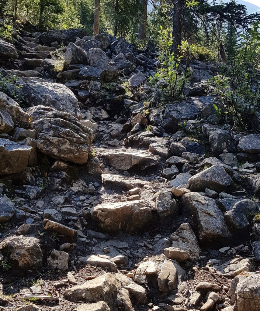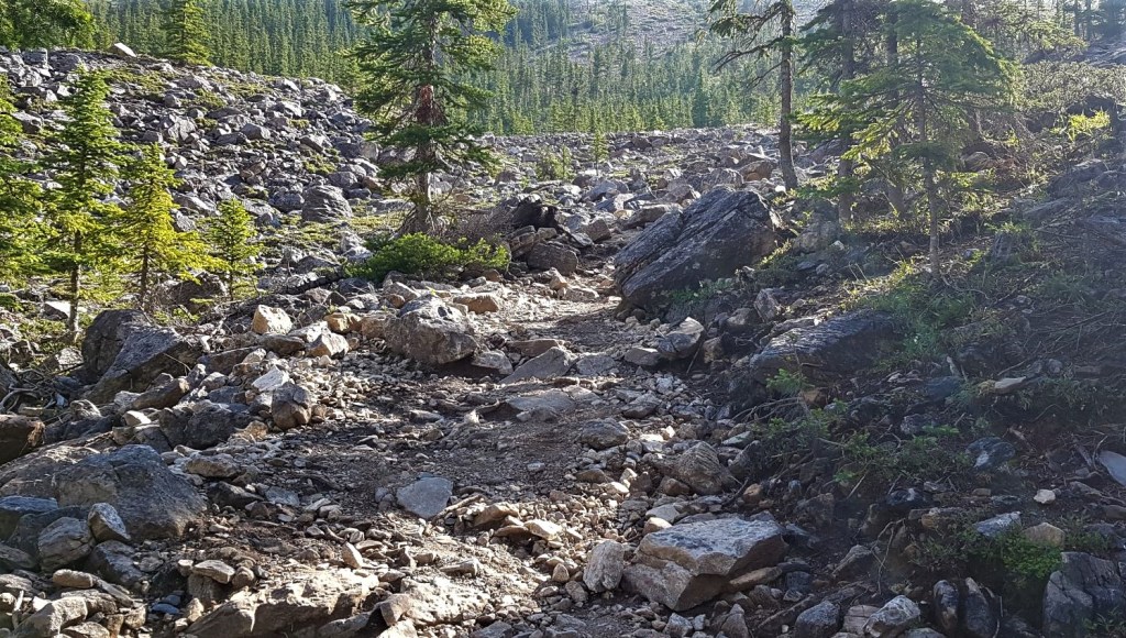 The trail goes through some rubble here. Keep an eye out for flattened rocks to stay on the correct path.