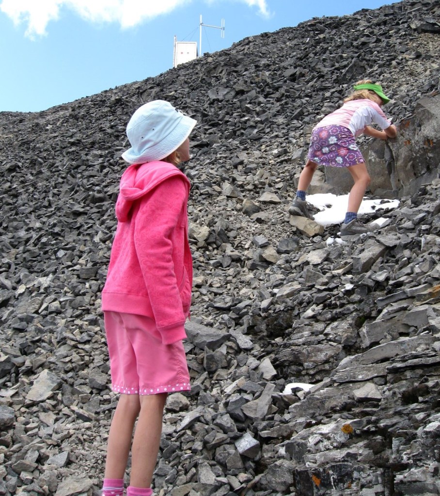 This was the only time my kids got a little uncertain. They could see the long drop below, but didn’t have the experience to know they weren’t going anywhere. Plus, the scree was difficult on their little legs. It was one step up, and two sliding steps back. Their dad put a hand on their bums to keep them going up.