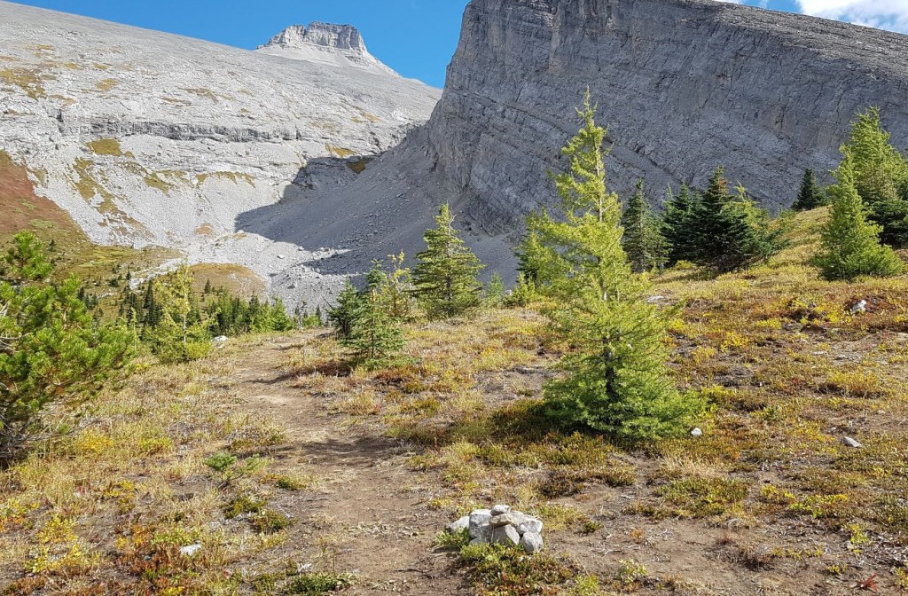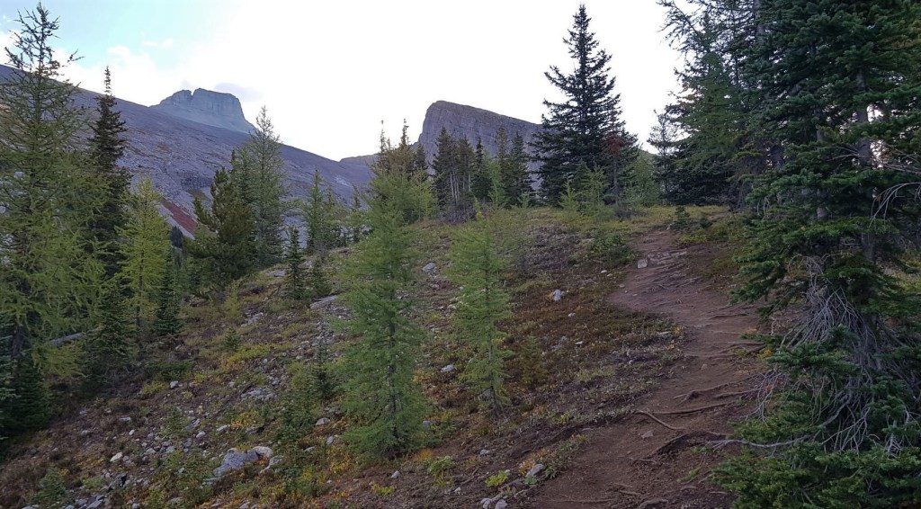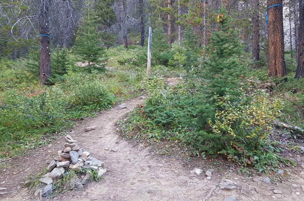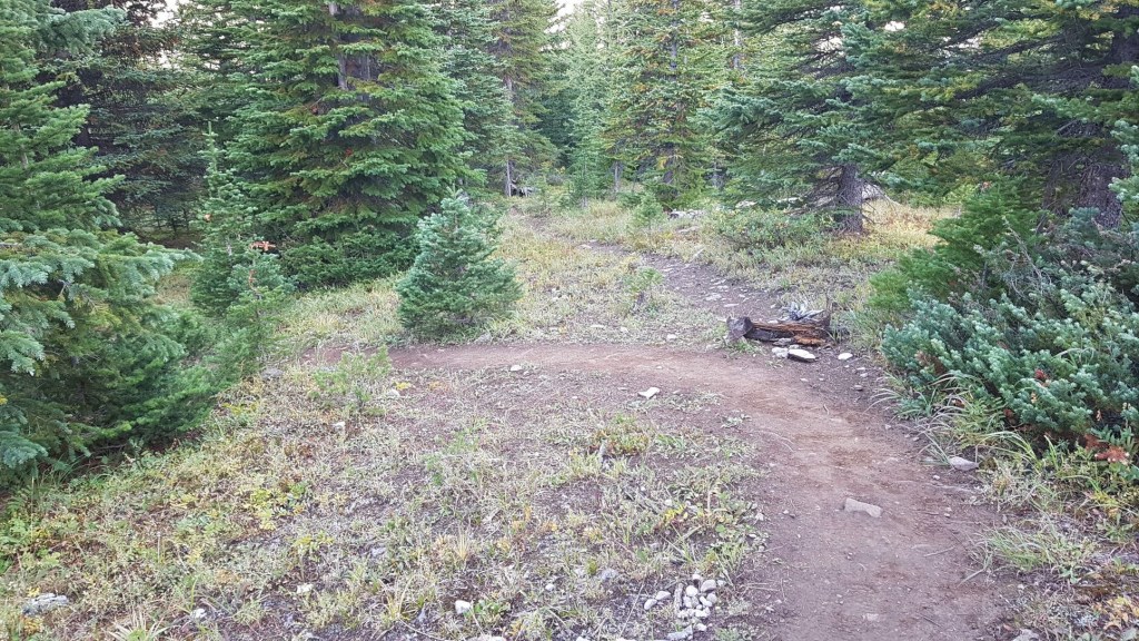 The High Rockies trail comes in from the north, and continues to traverse along to the south (right). The Sparrowhawk Trail continues straight up to the east.