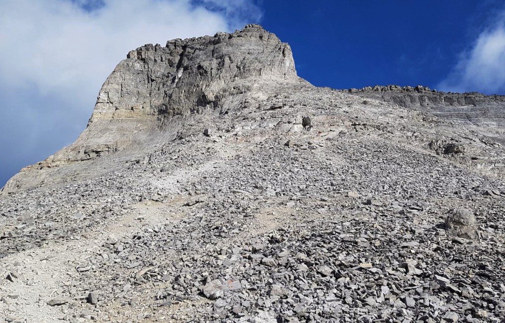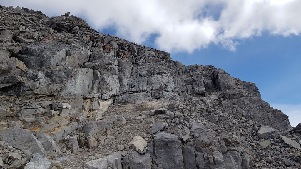While it’s hard to see here, the scree trail does lead up towards the shelf.