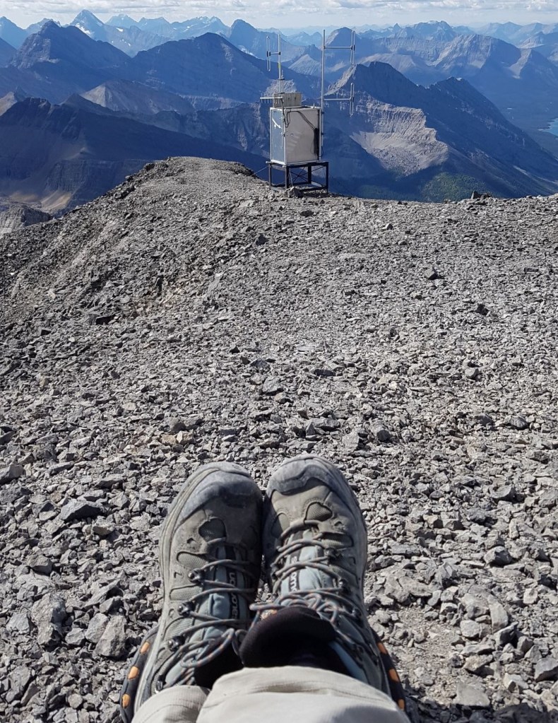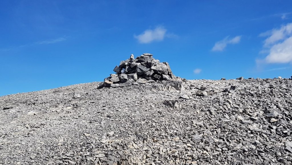 The summit cairn on Mount Sparrowhawk. The summit is a flat top, and I just walked up to it, like stairs leading to a landing.