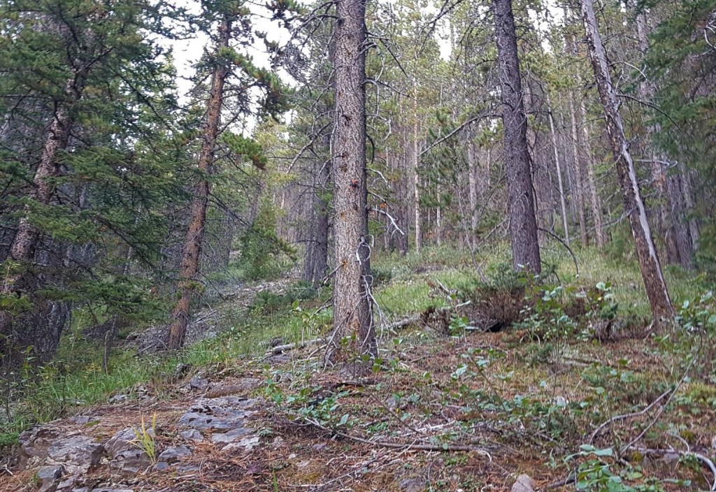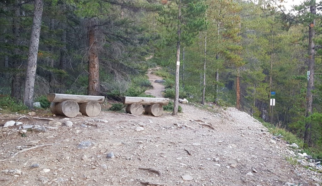 After about 1 km is the intersection with the High Rockies Trail and is marked by a couple of lovely benches. Go straight up here. The High Rockies trail goes north-south and follows the Smith Dorian Trail. This is a lovely mountain bike, hike or winter snowshoe route, BUT there is some avalanche danger so be aware.