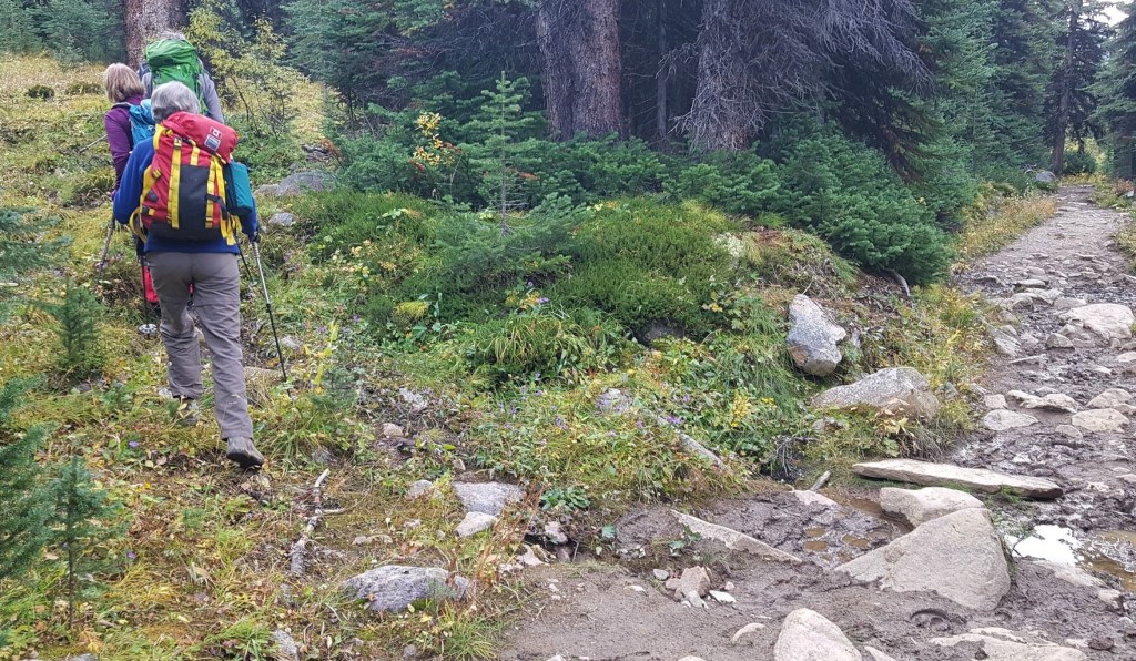 This photo was taken on the way back down, but it shows the break in the rock garden, our little marmot, and the expanse of meadow above the main hiking trail. Tonquin Valley Adventure lodge is on the shores of the lake, on the far right.