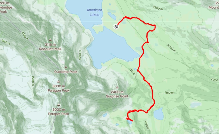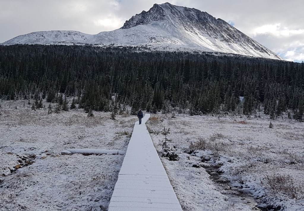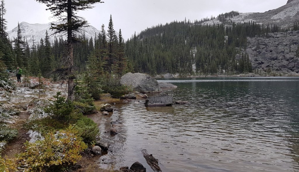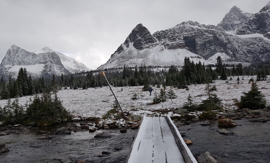 The highlight of this section was crossing the outflow of Amethyst Lakes. Thankfully there was a bridge here. Despite the weather, we got some beautiful photos. I imagine it’s even more gorgeous with fall colours.