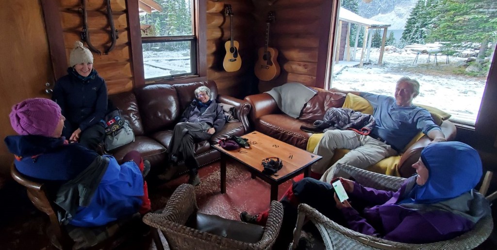 We chatted with several backpackers. They had spent the night, and were in various stages of packing up and moving on. We’d see them again over the next few days. Most were well outfitted, but one guy lacked gators and his pant legs were wet to above the knee. I felt for him as there was no way of drying that out in a tent. We did offer to feed and dry him out in the lodge, but he was enjoying his adventure and kindly declined.
