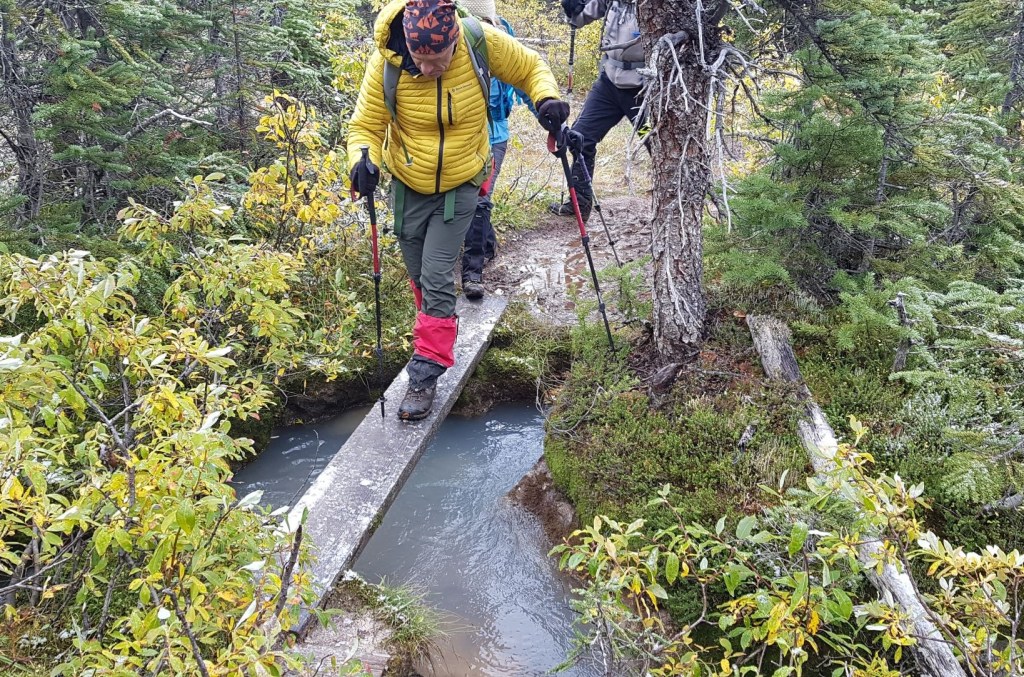 I have to say, this was not a typical hike. We started at the high point, and lost 400 m of elevation as we descended into the marsh lands. The trail was wet and muddy, and travel was agonizingly slow. Sometimes the trail was almost lost in bog grass, and we had to leap across small creeks. Even the bridges were wrong – one was so off kilter we had to use microspikes or risk going for a swim.