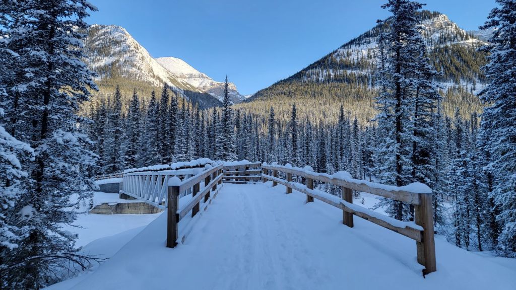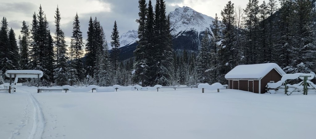 The ski starts just south of the Minnewanka parking lot. The first photo box is the Y junction. The second box is the Cascade River bridge. The third and fourth photo boxes are the Warden’s Cabin and cute snow covered gates.