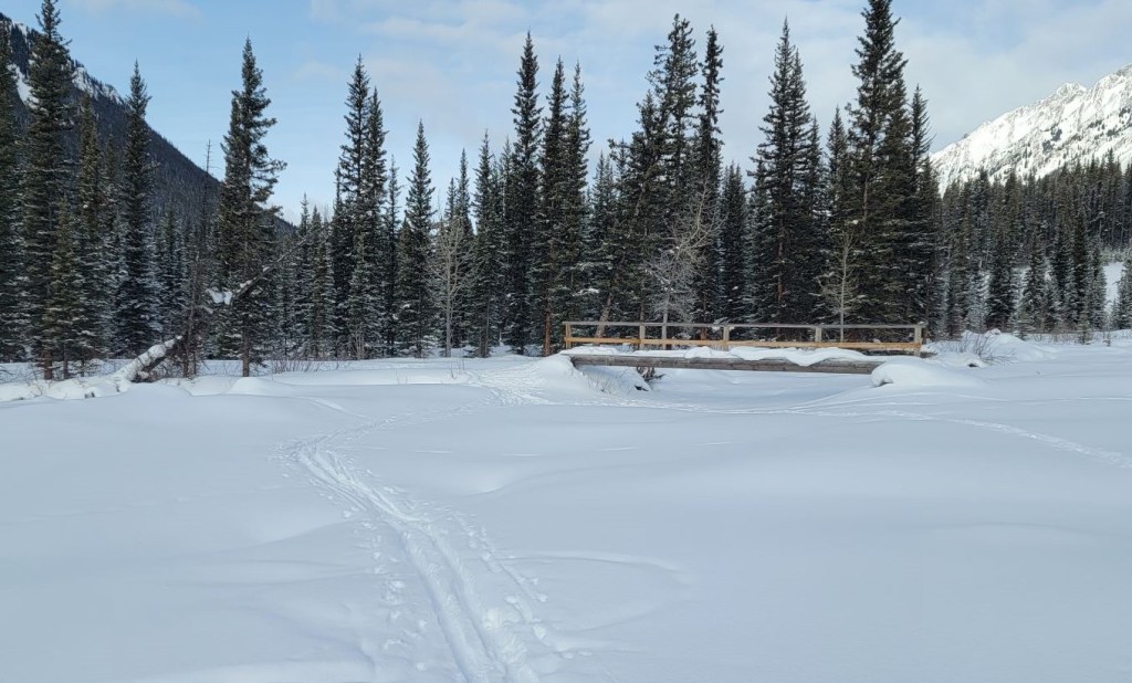 The Cascade River bridge at just over 6.1 km from the start, which makes for about a 12 km return ski. This is the ideal spot for beginner skiers to turn around. It’s a fairly good distance, the trails are wide, and the hills are very manageable.