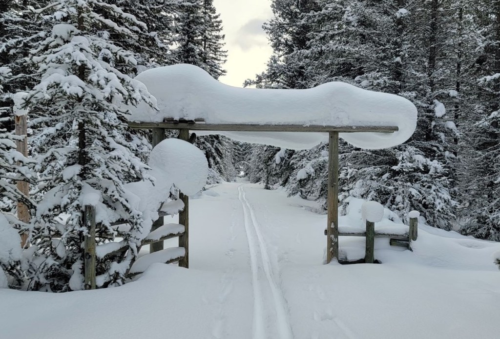 From the campground, we skied about 700 m to the side trail that would take us to the Warden’s Cabin. No one had been here today, so we got a little bit of trail breaking done. This section was gorgeous! A tight trail with snow hanging “Whoville” trees, and gates laden with snow. Magical.