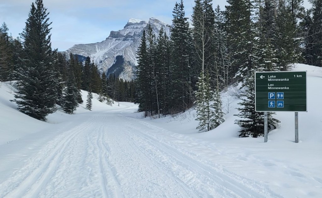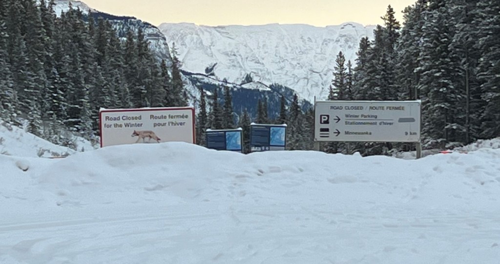 Keep going past this sign, all the way to the Lake Minnewanka causeway and Day Use area. While I believe it is possible to ski from this point to the Cascade Trail, there are no facilities and it would be a long ways.