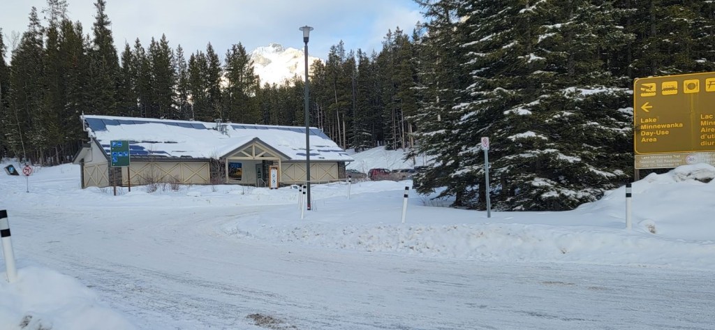 This is the Lake Minnewanka Day Use area. While I believe the building is closed in the winter, we parked to the right (east) as that’s where the outhouses are located. I am standing at the start of the ski trail, which is directly behind me.