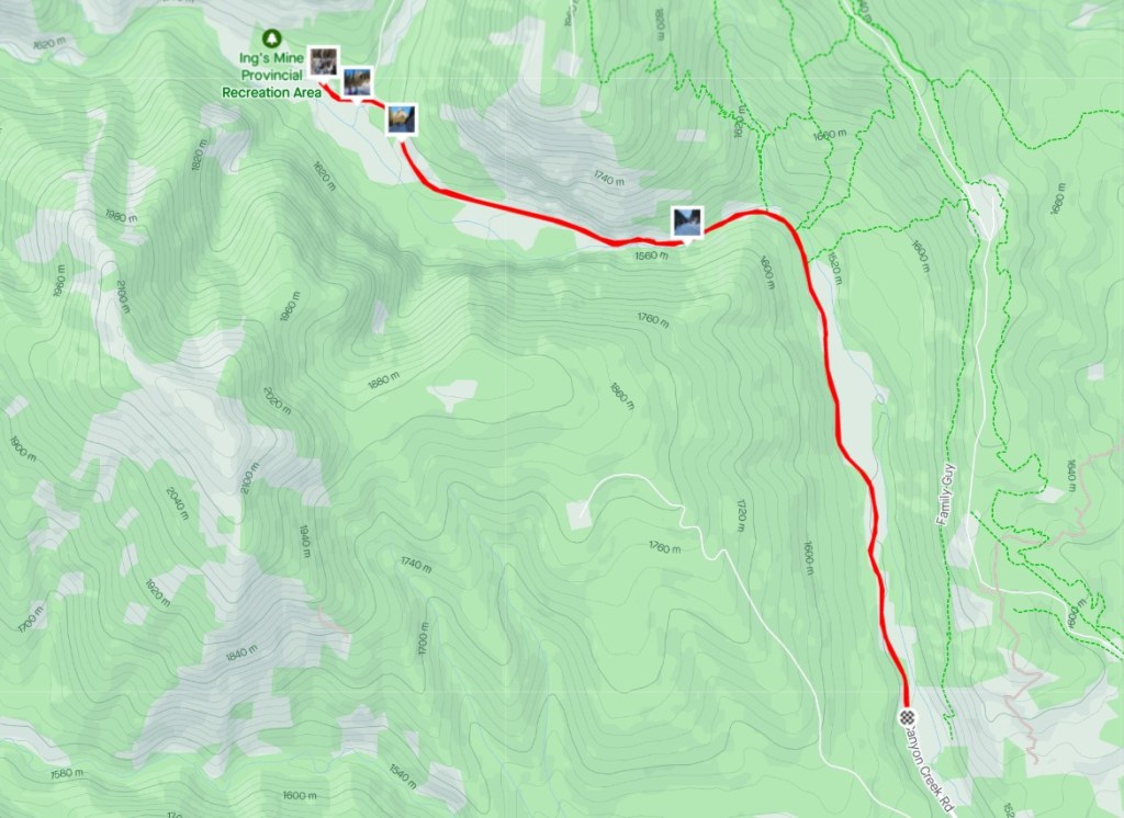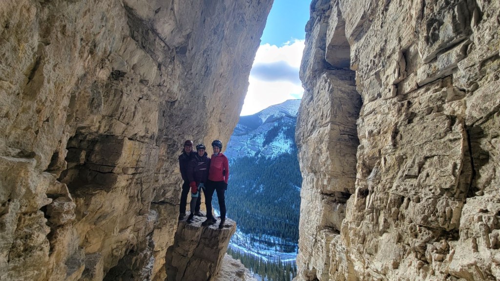 From the Canyon Creek parking lot, continue to bike (or walk) up the Canyon Creek Road for about 6 km. Pick up the hiking trail on the right. Gain elevation in a north west direction. Keep an eye on the vertical cave opening, and head for that. At cave, put on helmet and headlights. Return the same way.