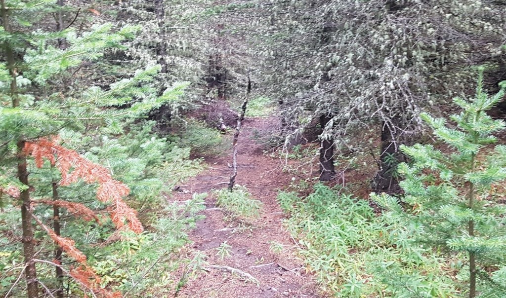 From this high point, the trail heads down into the valley between the two ridges, and ends at a cairn.